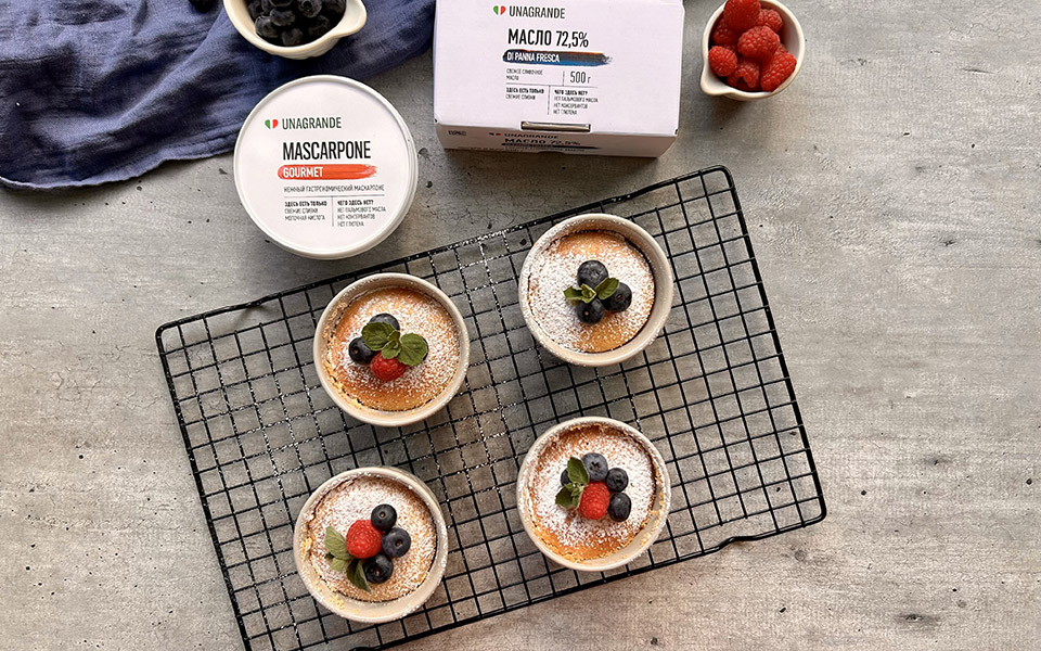 В чаше блендера взбейте желтки, мягкое масло, цедру и сок лимона (5 ст. ложек). Всыпьте сахар и просеянную муку. Влейте молоко и добавьте маскарпоне. Продолжайте взбивать до однородности.